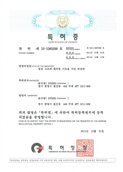 [특허증] 영상분필터내장-분전반